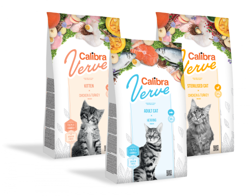 Calibra Cat Verve Sterilised Herring is a complete grain-free food with a high content of fresh fish. The recipe is designed for spayed and neutered cats. Fresh mackerel and salmon make up 29 % of the overall content. Animal source proteins make up 75.4 % of the recipe's total protein content.