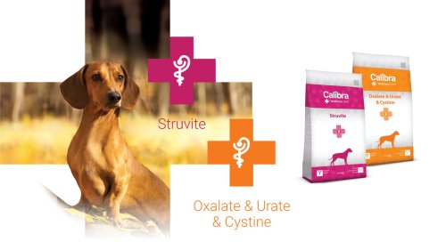 Urinary tract disease is one of the relatively common problems and health complications in dogs. The development of a urinary tract infection and the formation of urinary stones are conditioned by several factors – from breeding predisposition to diet. Calibra has created veterinary diets that help in the treatment of the most common types of urinary stones – especially the recipe for struvites and another recipe for oxalate, cystine and urate stones.